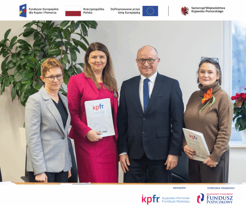 Na zdjęciu: Monika Szelc, Wiceprezes Kujawsko-Pomorskiego Funduszu Pożyczkowego, Agnieszka Wasita, Prezes Kujawsko-Pomorskiego Funduszu Pożyczkowego, Marek Wojtkowski, członek Zarządu Województwa Kujawsko-Pomorskiego, Kamila Radziecka, prezes Kujawsko-Pomorskiego Funduszu Rozwoju.