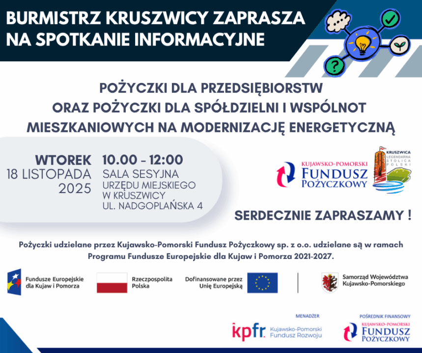 Wraz z Burmistrzem Kruszwicy serdecznie zapraszamy przedstawicieli spółdzielni, wspólnot mieszkaniowych oraz przedsiębiorców na spotkanie informacyjne poświęcone nowym instrumentom wsparcia – pożyczce na modernizację energetyczną wielorodzinnych budynków mieszkalnych i usługowych oraz pożyczkom dla przedsiębiorców.